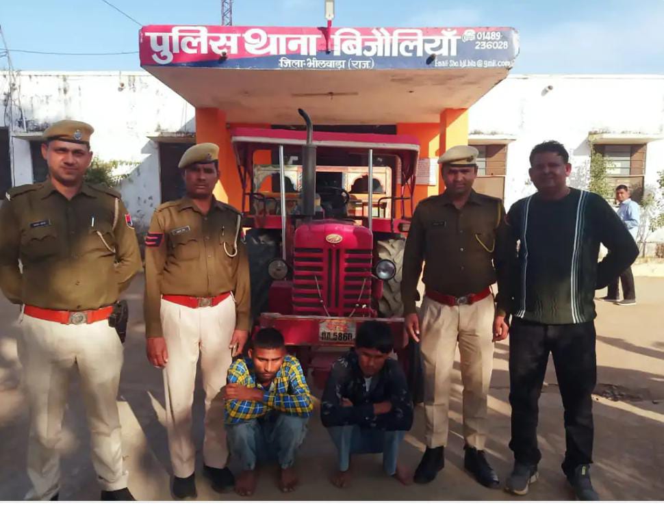 बिजौलिया, बलवंत जैन। बिजौलिया थाना पुलिस ने ट्रैक्टर ट्राली चोरी के मामले का खुलासा करते हुए हरियाणा के फतेहाबाद से ट्रैक्टर ट्राली बरामद कर दो आरोपियों को चोरी का माल बेचने से पहले ही धर दबोच लिया गया। थाना पुलिस के जांच अधिकारी हेड कांस्टेबल लक्ष्मण सिंह ने बताया कि 12 दिसंबर को बिजौलिया निवासी गोपाल प्रजापत ने उनका (Rj 51 RA 5860) महिंद्रा ट्रैक्टर ट्रॉली के साथ नायरा पेट्रोल पंप बिजोलिया से चोरी होने की एक रिपोर्ट दर्ज करवाई थी। थाना पुलिस ने तकनीकी साक्ष्यों के आधार पर नायरा पेट्रोल पंप सहित आसपास के करीब सो सीसीटीवी फुटेज गहन अवलोकन कर रूट मैप तैयार करते हुए लगातार आरोपियों का पीछा करते हुए अपनी पहुंच बनाई। इसी क्रम में पुलिस टीम ने फतेहाबाद पहुंच कर आरोपियों से चोरी किए ट्रैक्टर ट्रॉली को बरामद किया। कड़ी पूछताछ पर आरोपियों ने बिजोलिया के नायरा पेट्रोल पंप से ट्रैक्टर ट्राली चोरी करने की वारदात को कबूल किया। साथ ट्रैक्टर ट्राली को हरियाणा लाकर बेचने की बात भी स्वीकार की गई। थाना पुलिस ने दोनों आरोपी गोपाल पुत्र उम्र (37) खेम सिंह बंजारा निवासी फुलेता थाना नैनवा जिला बूंदी और मंगल सिंह बंजारा उम्र (24) पुत्र प्रभु लाल बंजारा निवासी चीता की झोपड़ियां थाना देई जिला बूंदी को मौके से गिरफ्तार किया।
